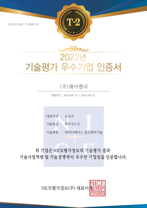 웨어밸리에 따르면 최근 신용평가기관 'NICE평가정보(주)'가 주관한 기술평가 등급에서 데이터베이스 접근제어기술 관련 최우수(T-2) 등급을 획득하는 성과를 거뒀다.