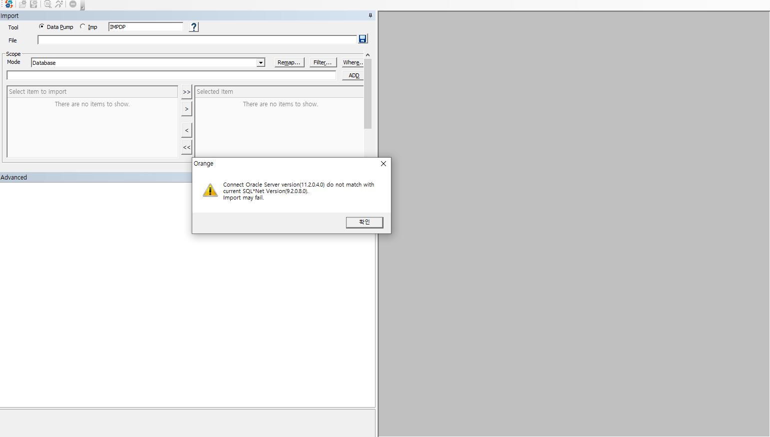 데이터 import 수행 시 붙임과 같은 메시지 발생을 하며 import가 되지 않습니다.