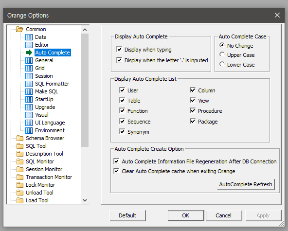 오라클의 경우의 옵션창 화면이며,