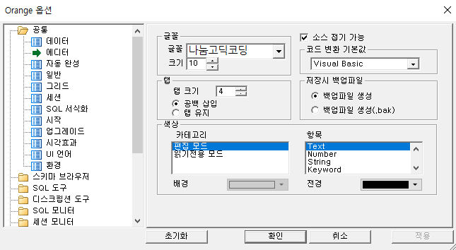 ② Orange 옵션 -> 공통 -> 에디터 -> 색상에서