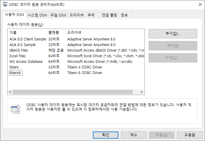 접속화면에서 odbc 드라이버에 tibero 6 드라이버가 나타자지 않아서 접속을 못하고 있습니다.