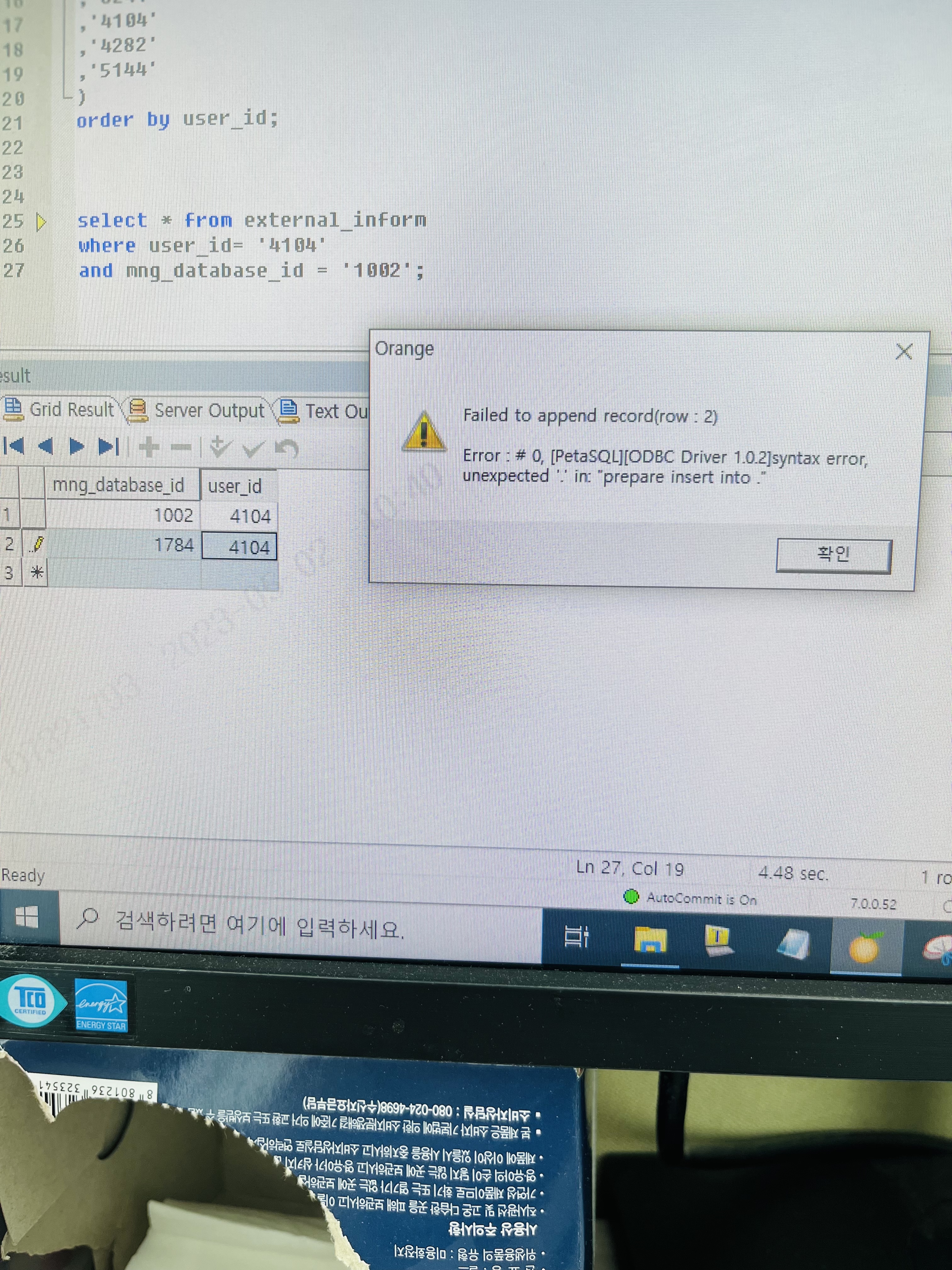 Edit mode 로 insert 하려하는데 첨부처럼 에러가 발생합니다